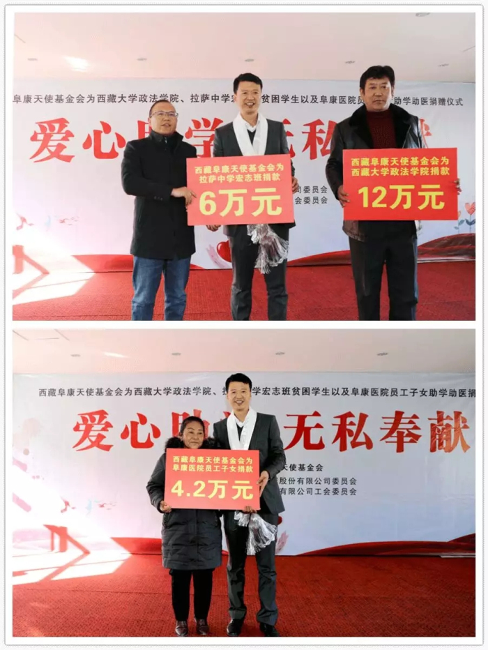 本次捐贈儀式,西藏阜康天使基金會為西藏大學(xué)政法學(xué)院30名貧困學(xué)生,每人每年捐助4000元的生活補貼,總金額為120000元人民幣;為拉薩中學(xué)宏志班10名學(xué)生,每人每年6000元的生活補貼,總金額60000元人民幣;為阜康醫(yī)院內(nèi)部6名貧困員工的子女(4名助學(xué);2名助醫(yī))給予助學(xué)助醫(yī)補助,每人每年6000元,總金額36000元人民幣。為社會學(xué)生2名(1名高中生、1名大學(xué)生);每人6000元,共計12000元人民幣。此次捐贈總金額為228000元人民幣。此外阜康醫(yī)院還分別為西藏大學(xué)政法學(xué)院20名和拉薩中學(xué)20名身體存在健康隱患的學(xué)生開通綠色體檢通道。