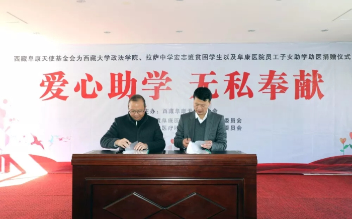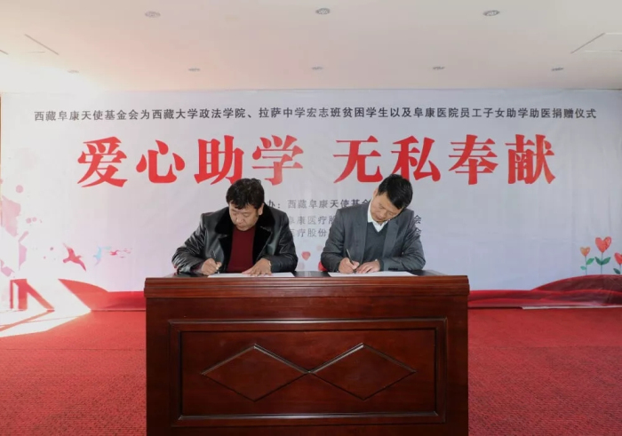西藏阜康天使基金會理事長、西藏阜康醫(yī)療股份有限公司黨委書記、董事長王斌與西藏大學(xué)政法學(xué)院黨委書記羅布簽訂捐助協(xié)議