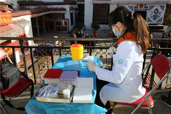 上午8點(diǎn),朱主任一行人分別從阜康婦產(chǎn)兒童分院和阜康健康體檢中心兩路出發(fā),經(jīng)過一個(gè)多小時(shí)的路途顛簸,于9點(diǎn)15分到達(dá)雄色寺,尼眾和駐寺干部們?cè)缫训群蛟谒聫R庭院內(nèi)。由于體檢項(xiàng)目中有血液檢查,不能進(jìn)食,為了不讓尼眾和干部們?nèi)甜囂?,朱主任一行人到達(dá)雄色寺以后,快速整理現(xiàn)場(chǎng),將所用儀器與藥品一一擺放整齊,在區(qū)婦聯(lián)領(lǐng)導(dǎo)講話以及受邀律師宣講完畢以后,立刻投入為各位尼眾與干部體檢的工作當(dāng)中。