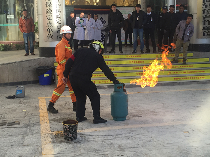 第二部分在我院住院區(qū)大院內(nèi),消防隊員進(jìn)行了現(xiàn)場演示,講解了如何使用滅火器,并現(xiàn)場點燃了一堆火,使用滅火器將大火撲滅,以直觀的方式,告訴醫(yī)護(hù)人員如何使用滅火器材;我院員工也派出后勤、臨床代表參加了演練。