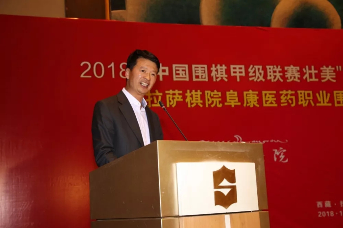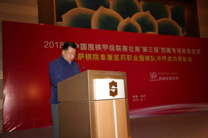西藏自治區(qū)政府副主席甲熱·洛桑旦增代表自治區(qū)人民政府對各位嘉賓的到來表示熱烈歡迎。他說圍棋是一切棋類運動的鼻祖,是中華民族優(yōu)秀傳統(tǒng)文化的瑰寶,融合了軍事、哲學(xué)、詩詞等多種文藝形式,是中華民族幾千年來智慧的結(jié)晶,也是對人類文明的重要貢獻(xiàn)。在建設(shè)社會主義文化強國、體育強國、實現(xiàn)中華民族偉大復(fù)興的中國夢進(jìn)程中,圍棋這樣一項由文化融進(jìn)體育的智慧運動承擔(dān)著重要的歷史使命。拉薩棋院西藏阜康醫(yī)藥職業(yè)圍棋隊沖甲成功是西藏體育發(fā)展的重大突破,也是社會力量推動體育事業(yè)發(fā)展的典范。為此我代表自治區(qū)人民政府對西藏阜康醫(yī)藥職業(yè)圍棋隊沖甲成功表示熱烈祝賀,對社會各界支持西藏體育事業(yè)發(fā)展表示感謝,自治區(qū)政府將加快推進(jìn)體育事業(yè)改革、做強做大體育產(chǎn)業(yè),促進(jìn)全區(qū)體育事業(yè)再上臺階。祝愿2018年中國圍棋甲級聯(lián)賽壯美“第三極”西藏專場取得成功,祝愿西藏阜康醫(yī)藥職業(yè)圍棋隊在明年的甲級聯(lián)賽中取得更好成績。