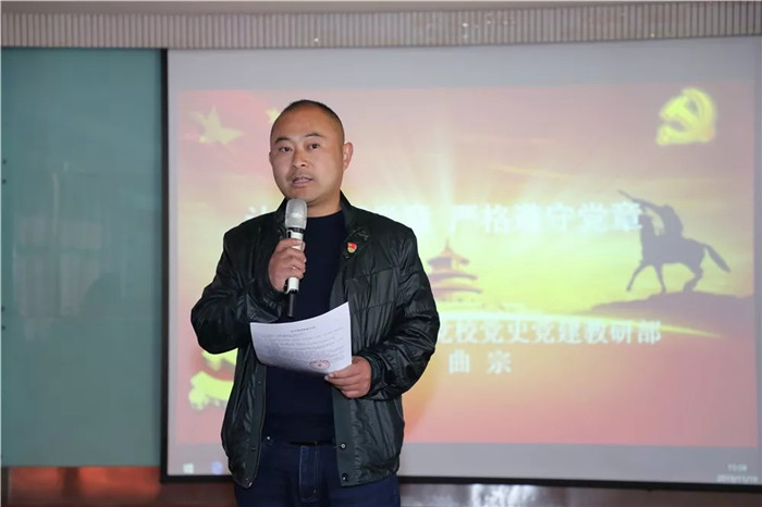 曲宗副教授首先明確了黨章 “根本大法”的地位,指出黨章是規(guī)范和指導黨的工作、黨內活動、黨的建設的根本依據(jù)。隨后曲宗副教授介紹了黨章的歷史沿革,以及十九大修改黨章的歷史意義和重要內容,號召每一名黨員認真學習黨章,嚴格遵守黨章,時刻與黨中央保持一致,自覺做到“兩個維護”。要求每一名黨員都把黨章作為政治思想建設方面的X光機,每年對照黨章給自己“體檢”一下,紅紅臉、出出汗,牢記入黨初心、遵守黨的紀律,維護一名黨員的思想行為純潔性。