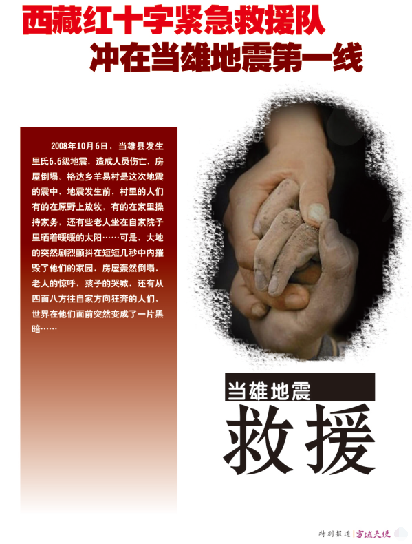 2008年10月6日,當雄縣發(fā)生里氏6.6級地震,造成人員傷亡,房屋倒塌。格達鄉(xiāng)羊易村是這次地震的震中,地震發(fā)生前,村里的人們有的在原野上放牧,有的在家里操持家務,還有些老人坐在自家院子里曬著暖暖的太陽 可是,大地的突然劇烈顫抖在短短幾秒中內摧毀了他們的家園,房屋轟然倒塌,老人的驚呼,孩子的哭喊,還有從四面八方往自家方向狂奔的人們,世界在他們面前突然變成了一片黑暗.....