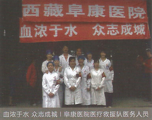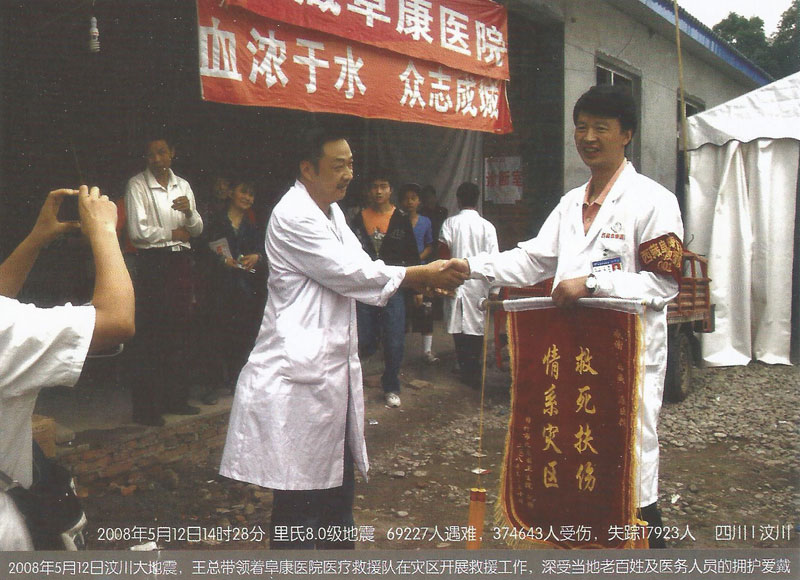 2008年5月12日14時28分,在得知發(fā)生在四川汶川8級的強(qiáng)烈地震后,王斌被深深的震撼了,5月13日第一時間帶頭捐款并號召全公司347名員工為災(zāi)區(qū)人民獻(xiàn)愛心,在王斌的帶領(lǐng)下短短的一上午公司即向西藏紅十字會捐款10062萬元(其中王斌個人捐款5062萬元)。13日下午,王斌隨即召開阜康醫(yī)院醫(yī)務(wù)人員趕赴災(zāi)區(qū)醫(yī)療救援動員大會,并迅速組建了一支由他本人作為領(lǐng)隊(duì)的26人醫(yī)療救援隊(duì)。同時他還帶領(lǐng)醫(yī)療隊(duì)為盡快抵達(dá)地震災(zāi)區(qū)并第一時間參與醫(yī)療救援,而且決定在成都臨時購買一輛配備完善的救護(hù)車,還包括大量藥品、生活物品、以及部分醫(yī)療設(shè)備,此次救災(zāi)共投入130余萬元。