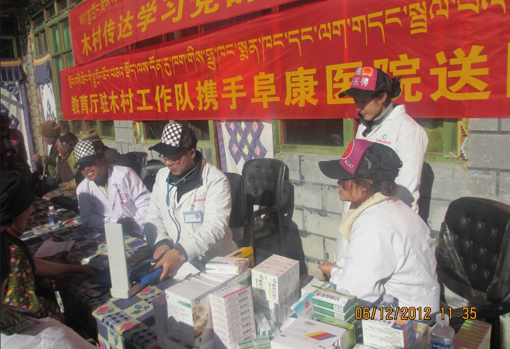 2012年12月5日,上午10點(diǎn),拉薩的太陽(yáng)高高地懸掛在天空,溫暖、舒適,我們四人在我院醫(yī)生王峰的帶領(lǐng)下,開(kāi)著越野顛簸在高原崎嶇的路上。此行,帶著我們阜康人的溫暖、帶著我們的專(zhuān)業(yè)技術(shù)、帶著我們阜康醫(yī)院一萬(wàn)多元的藥品,去山南洛扎縣木村,為當(dāng)?shù)氐睦习傩账歪t(yī)送藥。