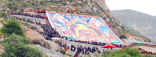 2013年的雪頓節(jié)于8月6日至8月12日在拉薩舉行。每年雪頓節(jié),晢蚌寺后山的展佛儀式都是一場(chǎng)重頭戲。盛大的展佛結(jié)束以后,才是羅布林卡的藏戲、歌舞表演,然后每家每戶吃酸奶。位于晢蚌寺后山腰上的巨幅釋迦牟尼唐卡畫像至今已有500多年歷史,高40米、寬34米。這幅由金粉、銀粉和珊瑚粉等繪成的巨型唐卡,平日深藏于寺院內(nèi),只有在雪頓節(jié)期間才在半山腰上以“曬佛”的行式展示在人們面前。這一藏傳佛教的盛事吸引了來(lái)自五湘四海的信眾和中外游客前來(lái)朝覲和觀瞻。在這一片歡樂(lè)、祥和、幸福的節(jié)日氣氛中,2009那次親歷哲蚌寺一睹展佛的壯觀場(chǎng)景又浮現(xiàn)在了我的眼前....