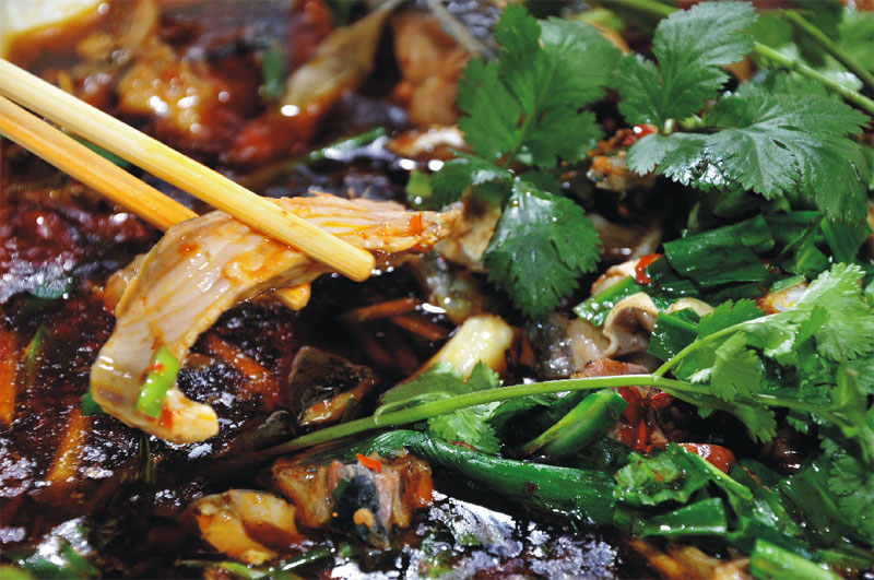 廣東人喜歡煲湯,卻把老火湯里豐富的湯料稱為湯渣,一般只作為正菜前的消遣而已。四川人的燉菜則是絕對的主角,無論是家里的餐桌還是飯店的酒席,一般上了燉菜,也就意味著宴席進(jìn)入高潮。過去,家里最喜歡做海帶燉雞,老母雞加海帶,拍幾片生姜,扔一束香蔥,快起鍋的時(shí)候?yàn)⒁恍},湯清肉香,老遠(yuǎn)聞到就忍不住想去揭一下鍋蓋。那時(shí),我最得意的是用小碟子,只放一些干辣椒粉和鹽,舀一小勺雞湯拌勻了,做成蘸水,隨手揭一塊雞皮在蘸水里一裹,滋味純粹而濃烈,讓人每次想起,都忍不住要閉上眼睛猛吸一口氣,仿佛那味道又在舌尖上打轉(zhuǎn)。