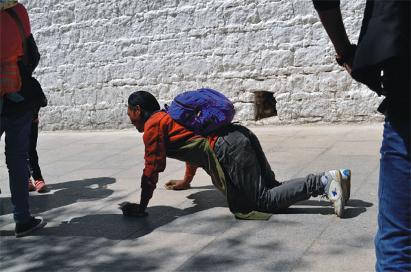 前幾天在大昭寺廣場,看人們磕長頭。人很多,其中多數(shù)應該是牧區(qū)上來的,臟亂的衣服,掩不住滿眼的虔誠。有的人累了,便坐在那里和身邊的一或兩人輕聲地說話,大多數(shù)人,則是重復著相同的動作:面向大昭寺,不停起身,然后跪倒全身俯地……從早到晚,日復一日,簡單而長久。