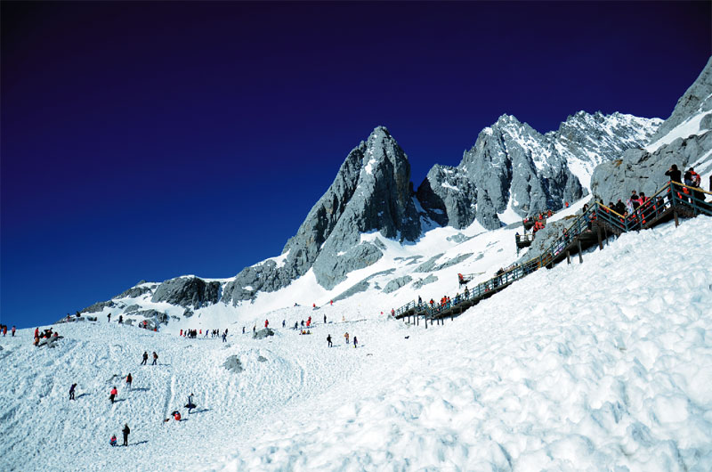 人文的掃興,索性來場自然之旅。第二天一大早我們就前往了玉龍雪山,還是被告知到達(dá)最高峰的索道票昨日售盡,我們的索道只到得了松杉坪?;貞浧饋?,這也許值得慶幸。松杉坪松樹高聳如云,木棧道旁有積雪未化,風(fēng)過樹梢的積雪隨風(fēng)灑落,偶爾有小松鼠一躍而過,牦牛悠閑自在的吃著草,遠(yuǎn)處是玉龍雪山的最高峰,仿佛近在咫尺。我想所有的生生死死都應(yīng)該在這里戛然而止,所有浮躁的靈魂都應(yīng)該在這里接受洗禮,進(jìn)入輪回,拋卻紅塵暫享這片刻的永生。她是我去過最接近天堂的地方,
