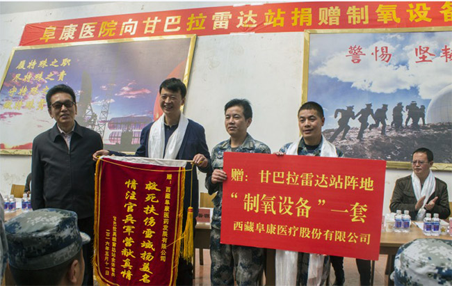 2016年5月11日,西藏阜康醫(yī)院有限公司向甘巴拉雷達站捐贈制氧設備儀式在甘巴拉雷達站營地舉行,西藏自治區(qū)政協(xié)副主席、區(qū)工商聯(lián)主席、區(qū)總商會會長阿沛·晉源,區(qū)工商聯(lián)副主席劉洪,區(qū)工商聯(lián)政研室主任張云寶,區(qū)工商聯(lián)經(jīng)聯(lián)處副處長秦林,95662部隊政治委員楊壽保,甘巴拉雷達站政治教導員李再華,西藏阜康醫(yī)療股份有限公司黨委書記、董事長王斌,黨委副書記、總院長張德才,黨委紀檢委員、總經(jīng)理陳彬以及甘巴拉雷達站全體官兵等出席了本次捐贈儀式。