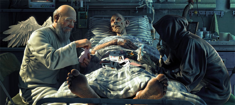一個(gè)將死之人,在彌留之際,發(fā)現(xiàn)身邊坐著兩個(gè)人,魔鬼和天使。他們?cè)诖策呁媾疲⒁耘凭终撦斱A,賭這個(gè)人的靈魂是飛到天堂,還是下到地獄。他緊張地看著牌局,不知道自己的命運(yùn)會(huì)怎樣。